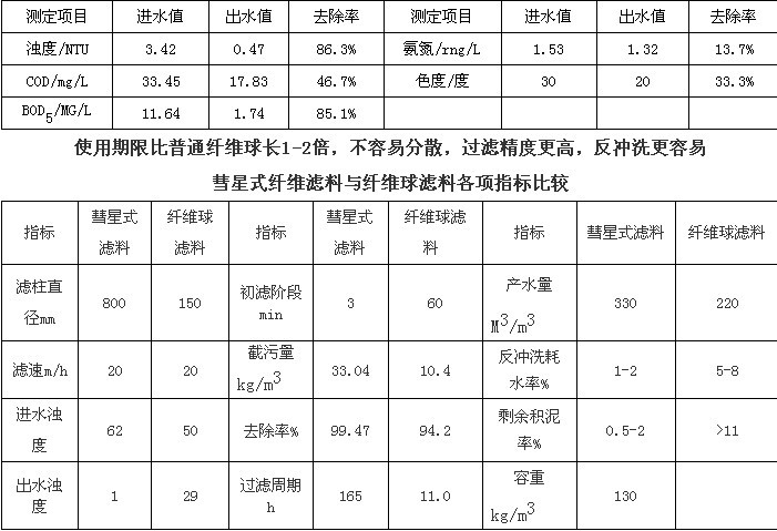 彗星式纤维滤料是一种新型的过滤材料,是在扎捆式纤维球基础上研究而成,不容易散开。它既有纤维滤料过滤精度高和截污量大的优点,有具有颗粒滤料反冲洗洗净度高和耗水量少的优点,由该滤料形成的滤床空隙率分布接近理想滤料的结构。在该滤床的横断面(水平)上空隙率分布均匀,确保了过滤时水流通道大小一致性,其直接效果是截污量均匀,水流短路现象得以避免。在该滤床的纵断面(垂直)空隙率分布由上至下逐渐减少,空隙率沿滤床纵断面呈上大下小的梯度分布,该结构十分有利于水中固体悬浮物的有效分离,即滤床上部脱附的颗粒很容易在下部窄通道的滤床中被捕获而截留。