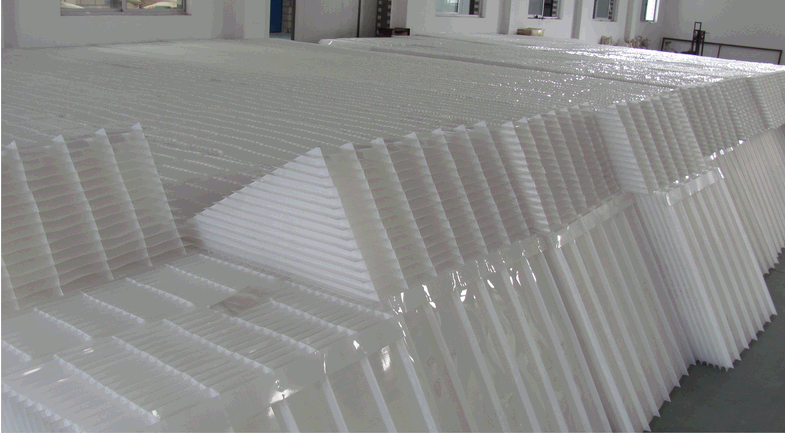 斜板填料主要由共聚及聚丙烯材料混合制成。从浅层理论的基础讲,在斜板上部设置沉淀距离合理的沉淀段,在下部控制斜板的几何形状,使斜板下部形成稳定的接触絮凝段,通过接触作用和浅池沉淀机理达到矾花与水分离的目的。各种间距斜板填料均是通过不同高度的塑料肋条来支撑斜板片,肋条与斜板热熔焊接,每两层斜板片之间需要多根肋条支撑,组装工艺复杂,而且传统斜板内部水流流道成矩形,常适用于上向流沉淀池。